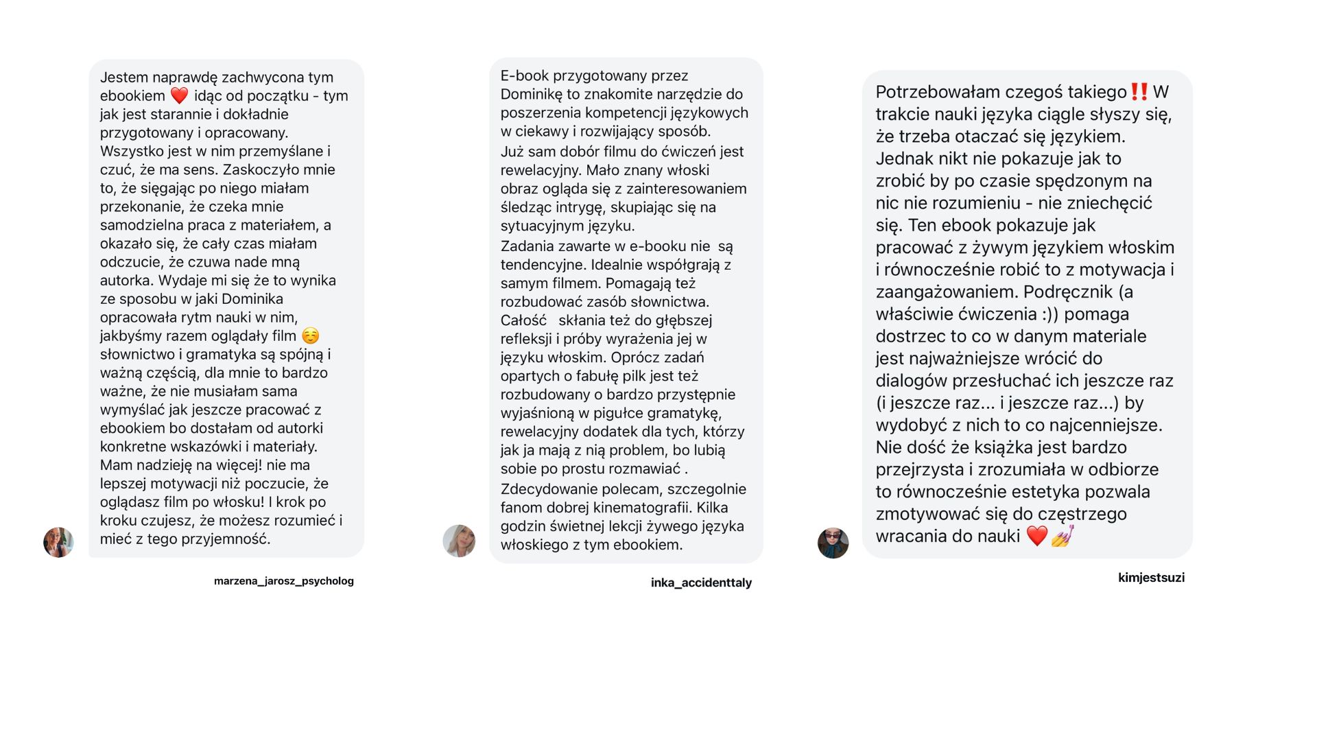 Ten e-book to więcej niż narzędzie do nauki, to inspiracja, rozwój i przyjemność płynąca z odkrywania języka włoskiego przez pryzmat kina.